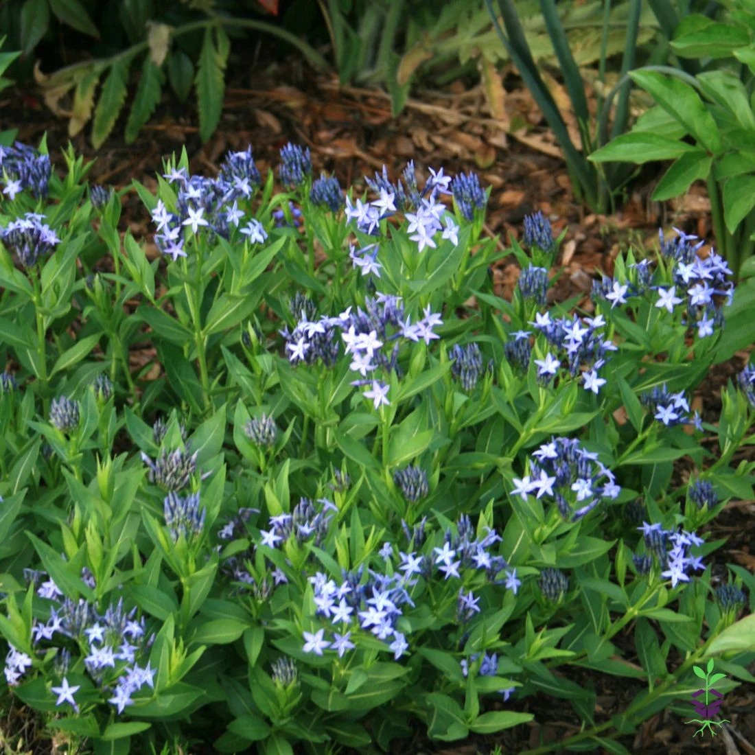 Amsonia x ‘Blue Ice’ has dark blue buds that open from late spring to early summer. This hybrid Blue Star blooms considerably longer and stronger than other Amsonia. Like other Blue Star, its dark green leaves turn brilliant yellow in fall. Amsonia ‘Blue Ice’ is usually late to emerge in spring and spreads by underground rhizomes to form an attractive ground cover.
