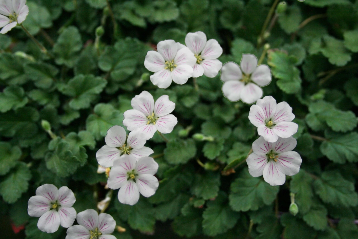Erodium reichardii ‘Alba’ has small, deep green oval leaves with scalloped edges that form a dense weed suppressing cushion. Erodium ‘Alba’ bears small but exquisite, pure white flowers with pink veins throughout the spring. Erodium ‘Alba’ is nice in rock gardens and makes a cute addition to fairy gardens.
