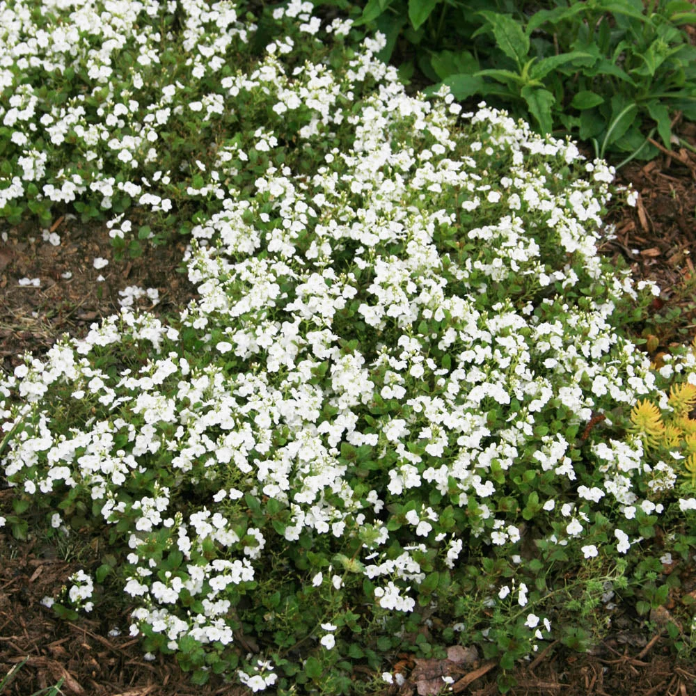 Veronica peduncularis ‘Whitewater’ is a low creeping perennial with snowy white blooms in spring. Its shiny, dark green foliage turns to burgundy and bronze in the fall. Veronica ‘Whitewater’ may bloom sporadically throughout the summer. Also known as Creeping Speedwell, this Veronica makes an excellent evergreen ground cover.